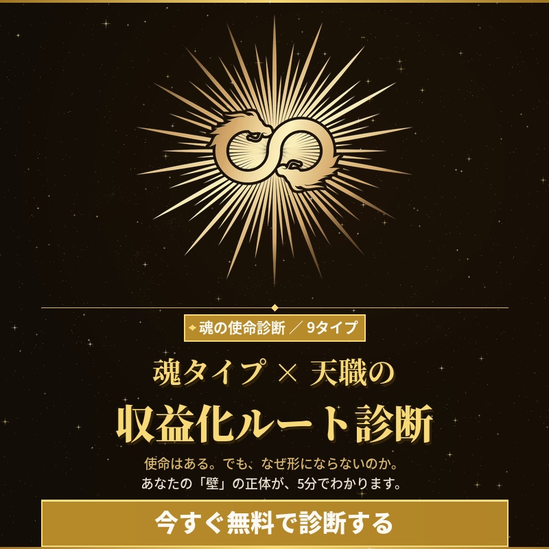 魂の声を“言葉と行動”に変え 使命を天職と収益にするサポート がんばっているのに結果が出ない このままで終わりたくない 40代・50代女性へ 🌟魂の使命診断(無料) 魂タイプ×天職の方向性がわかる 👇今すぐ診断