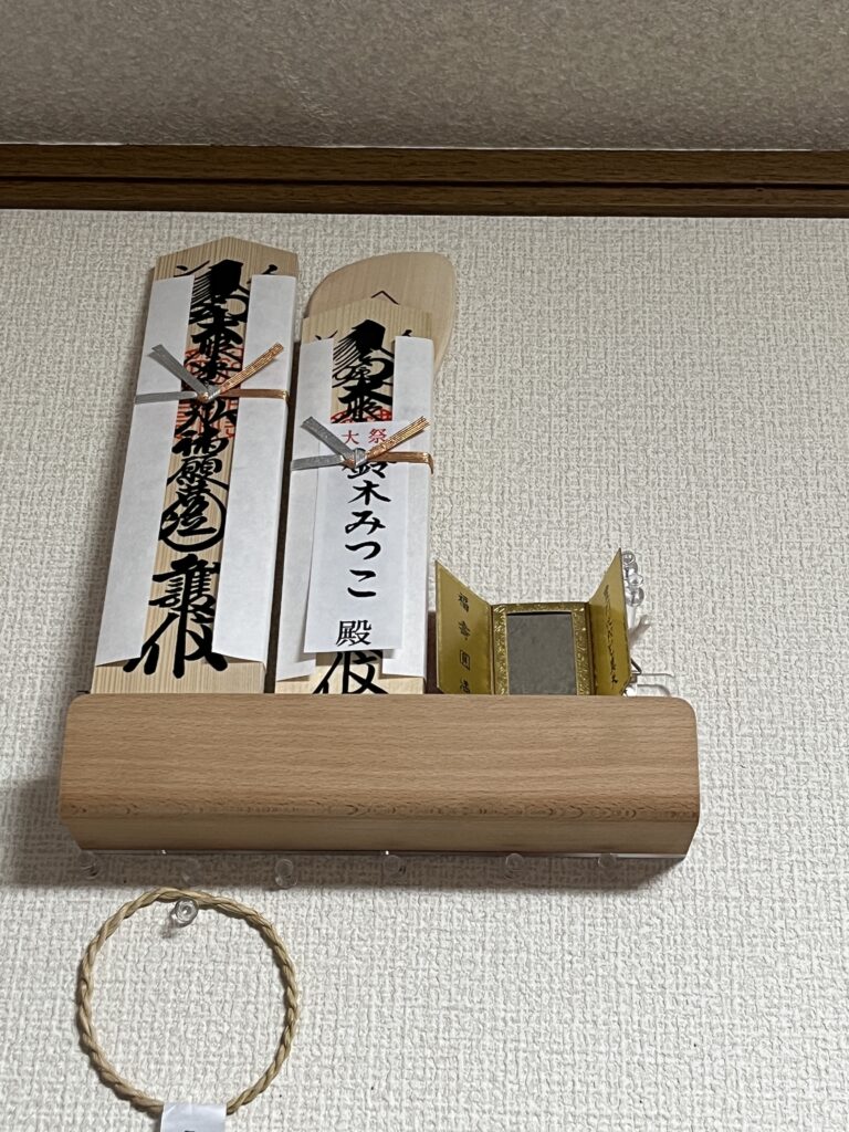 自室のダキニ天さんコーナーのおふだたて 一番左: 今回 豊川稲荷・本山のご祈祷でいただいた おふだ 中央: 先月の大祭で 豊川稲荷・東京別院のご祈祷でいただいたおふだ (背面にあるのは、その時いただいた 杓文字しゃもじ) 右: 豊川稲荷・東京別院でいただいた 御影守