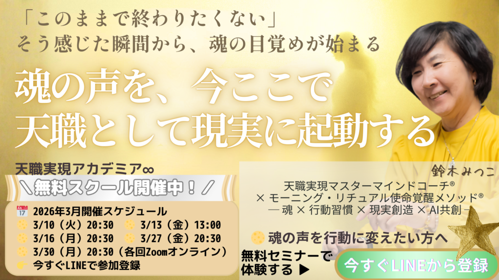 ◆ 天職とライフキャリアの再設計 12ステップ×習慣化×完全伴走で“動ける私"へ 【3月体験セミナー日程公開】 追伸です。 3月開催の体験セミナー日程を公開しました。3月は、卒業シーズン。 一区切りを迎える人も多い時期です。 そして4月は、スタートの季節。 環境が変わる人も、 肩書きが変わる人も、 何も変わらない人もいるでしょう。 でも―― 本当に変えるべきなのは、環境ではなく前提です。 先にお伝えします。 この時間は、 「もう十分わかっている」 「気づきはある」 「自分の課題も理解している」 そう思っている方には、向いていません。 今回のテーマは、 知識を増やすことではなく、 現実を動かすこと。 2026年は、 気づき止まりの人と、 仕組みで前に進む人が、 はっきり分かれていきます。 ・違和感には気づいている ・本音もわかっている ・評価優先OSにも心当たりがある それでも、 働き方は変わらない。 収入も変わらない。 夜のざわつきも消えない。 もしここに思い当たるなら、 それは能力の問題ではありません。 環境と構造が、まだ整っていないだけ。 今回の体験セミナーでは、 ✔ ととのえる(習慣化) ✔ 手放す(ブロック解除) ✔ つながる(使命覚醒) ✔ 行動する(ビジネス構築) この12ステップ×4フェーズ構造を通して、 「知っている私」から 「動ける私」へ進む設計を体感していただきます。 3月という節目は、 何かを終わらせるためだけの時期ではありません。 “古い前提"を卒業するタイミング。 4月からのスタートを、 ただのカレンダー上の変化にするのか。 それとも、 自分軸で再設計された人生のスタートにするのか。 その分かれ道が、いまです。 もし今、 「もうこのままで終わりたくない」 「次のステージに進む準備はできている」 そう感じているなら。 この機会に、 一度しっかり自分と向き合ってみませんか。 違和感を不安で終わらせるのではなく、 ワクワクする次の一歩へ変えていく。 卒業とスタートの季節に、 あなた自身の前提を更新する。 ここから、新しい章を始めましょう。 使命覚醒3ステップ体験セミナー https://mitsuko8888.com/lp/ LINE登録(特典受取はこちら) https://line.me/R/ti/p/@882jdtai ※参加者限定で 「魂OS・90日実践ガイド」をお渡ししています。 気づきの人生から、 設計された人生へ。 4月を、ただ迎えるのではなく、 自分で創る春に。 次のステージでお会いしましょう